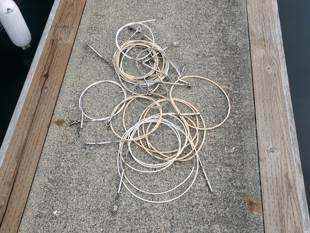 be called, Lines of Last Resort, are one of those things which every sailboat has but you never notice. That is until you take them off, which is what we did upon pulling up to our winter home here in Friday Harbor. Our lifelines are likely the originals that came on the boat. They are a classic example of a race boat setup from the era. They are swaged stainless steel wrapped with that terrible plastic covering. Karma is without a lifeline gate setup in the stanchions and the entire length of the boat’s lifelines were tensioned in one spot. This means when they are undone about 2/3rds the way back to board the entire length of the boat’s lifelines on that side go slack.