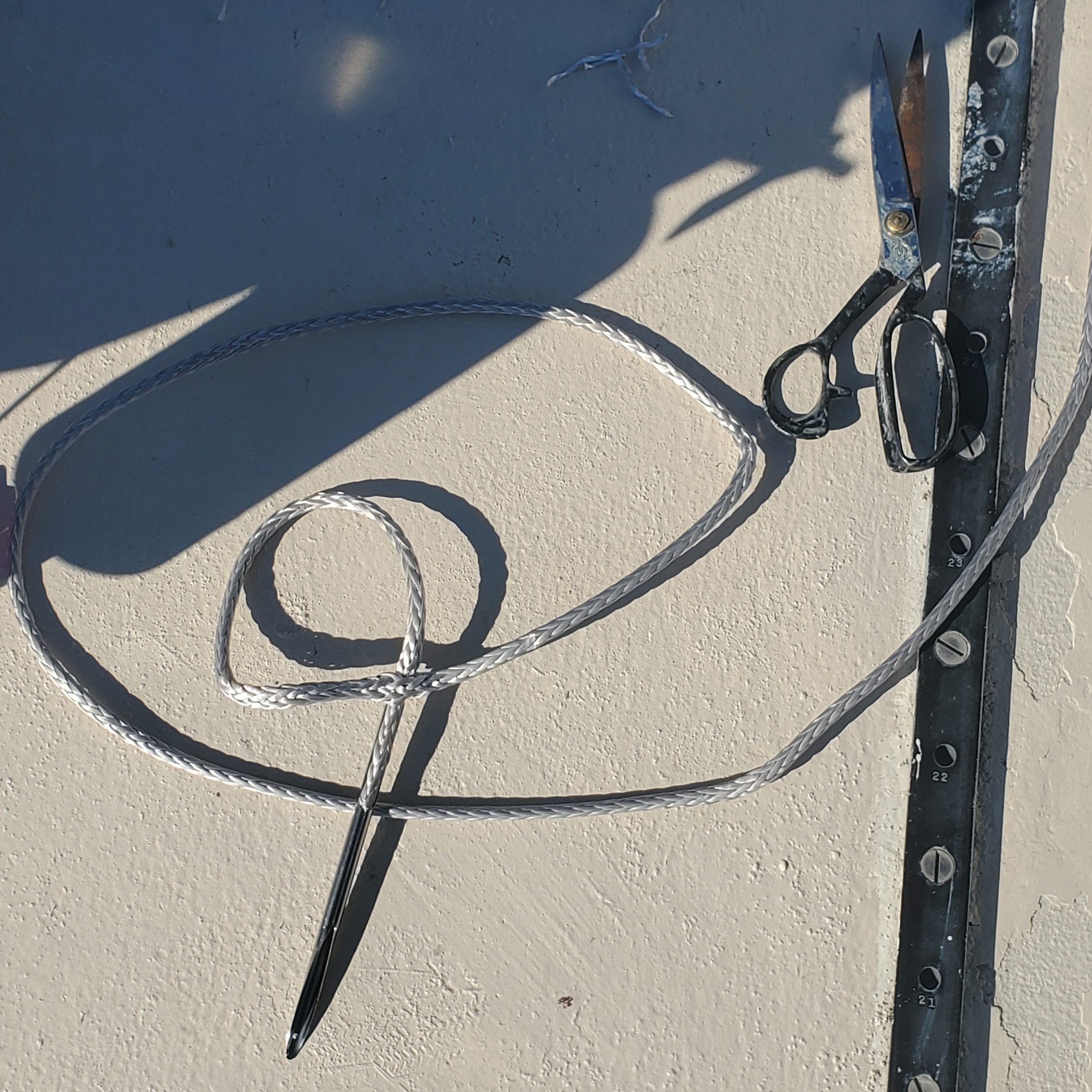 Overall the process is rather simple. We can splice an eye in one end of a line, run it down the boat through the stanchions, then roughly lay it out tight and cut. Because to tension everything we are using lashings we don’t have to be massively accurate unlike if we were splicing to turnbuckles. I’m still in awe of this material. The splicing process is dead simple and relies essentially entirely on friction. You find out where you want your loop, pass the line through itself, then bury the end. Tapering the buried line sounds and looks complicated until you do it once and realize the entire goal is just to have each of the 12 strands end at different spots so there are no hard edges. You can then pull the whole thing tight and it just…. sorta…. stays_? Perfect! We have some experience with this as we have some synthetic standing rigging we made while we had the mast down. There will probably be a massive article on that here in the near future.