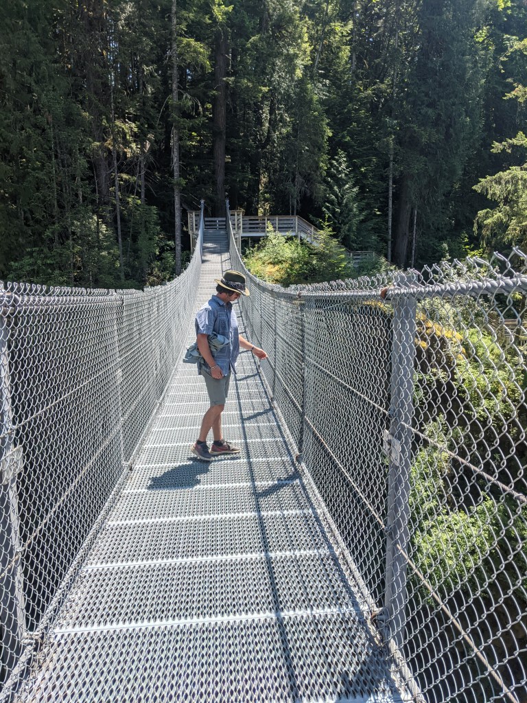 The first full day we spent wandering around the island, getting a coffee and pastry at their local shop in the town at Q cove. We then hit the streets to wander around and get a feel for the place. The next day was the day our backup starter we ordered into Campbell River was to arrive so we hit the ferry early and headed over to explore. It was surprising how loud walking around a semi-busy town felt after the last 4 weeks of no traffic noise. It was not long before we gravitated towards a nature preserve with a wonderful hike ended at a suspension bridge! At this point we heard word our starter was in so we headed back via a hitchhiking ride from a nice local fella and some fish and chips later we were back on Karma ready to hit the current to stage for the Seymore Narrows the following morning.