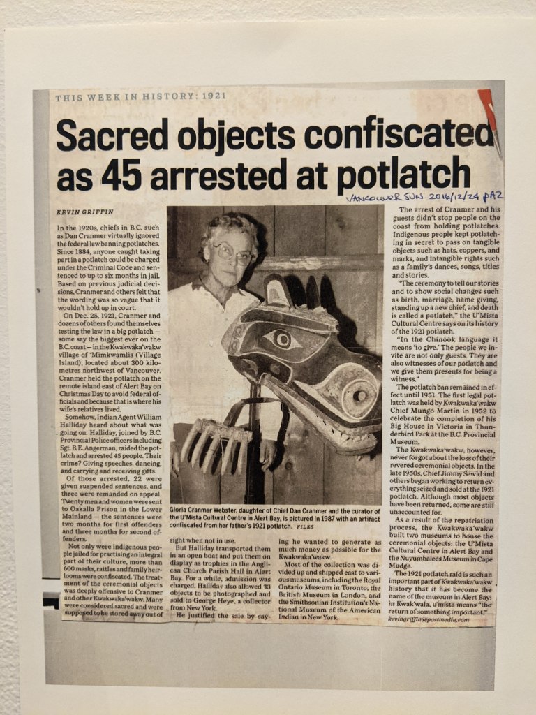 The potlatch was banned in Canada between 1885 and 1951. The masks and other regalia that you see here were all confiscated after an illegal potlatch in 1921. After the ban was lifted, the Kwakwaka’wakw people fought for decades for the return of their sacred regalia that had ended up in museum and private collections around the world. Most of the regalia has come home and it is shown here at the U’mista Cultural Centre and at the Nuyumbalees Museum.