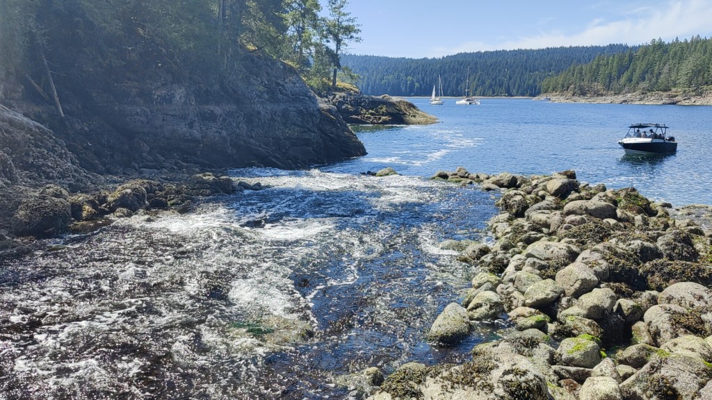 A few beers, popcorn, and silly movie later we decided to leave and head across the way to Squirrel Cove on Cortez Island. This did have hikes as well as a tiny town accessible. Anchoring in the middle of the bay by Dual Dragons, we set the hook and finished the hatch install, deciding to