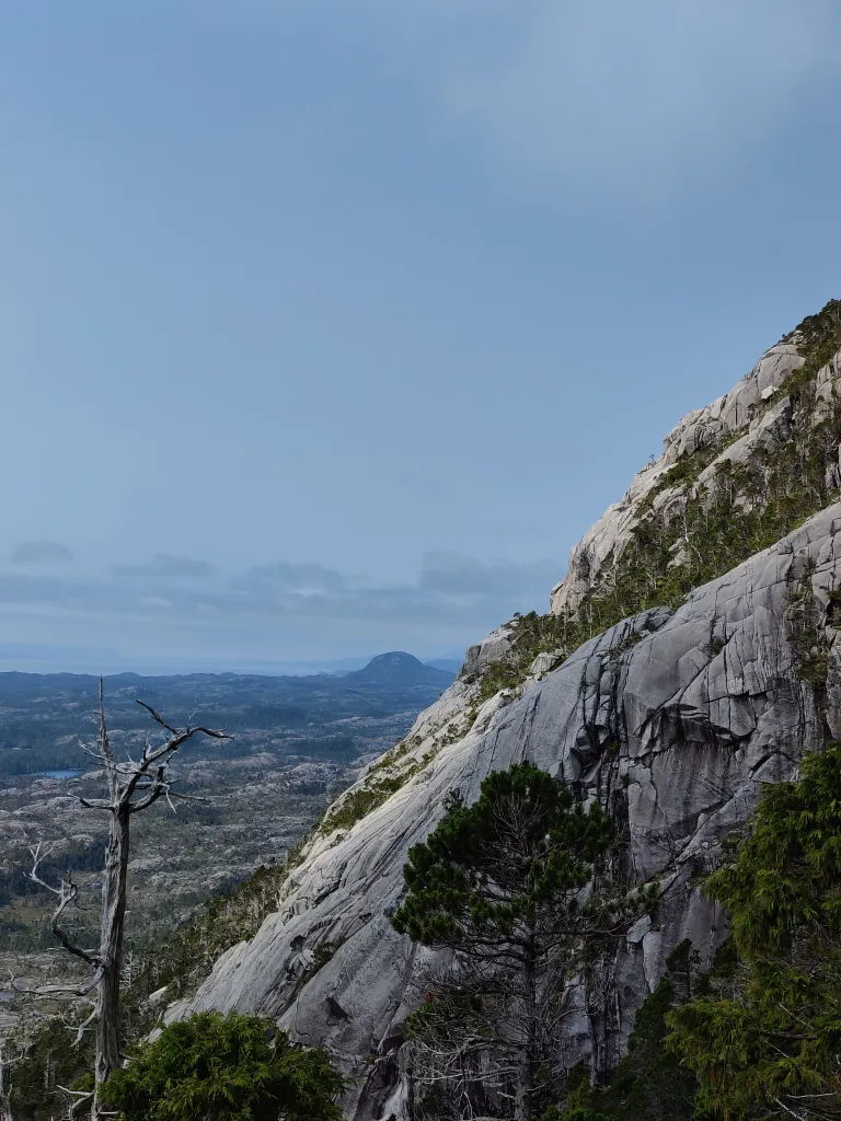 Being an uninhabited island amongst a vast chain of uninhabited islands far from any settlement lands us clambering over trees, through bushes, and entirely making the trail up ourselves. It was a good move that we all were wearing pants and not shorts. The fog had mostly cleared at this point and each time we find ourselves on a rock out of the thicket of trees the view gets better and better. It was surprising how high we were actually able to climb up, though eventually we were at a peak which was separated by a huge valley which had us snacking and calling this the top for us.