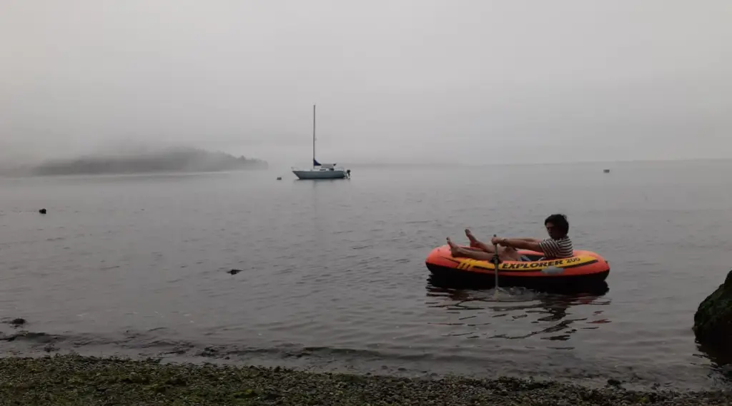 Before I dive into Karma dinghy chronicles, here is where we have been with dinks. A Clark San Juan 23 (swing keel) named Nibbles was our previous vessel. It slept in the Duwamish River and ventured as far as Sucia in the San Juan Islands. Newbs to cruising, sailboats, all of it really, we did some research and found out that to get to shore, a crew needs a dink. So we pooled our money and invested 40 dollars into the ExplorerTM 200. That plus some duct tape got ourselves, friends, firewood, and the pump to shore consistently for over a year. I like to imagine that the new owners of Nibbles still find joy in using it. I also like that I don’t have to deal with taking on water and deflating at the same time anymore. The resilient dink from our previous boat Nibbles ft Paul and Mary
