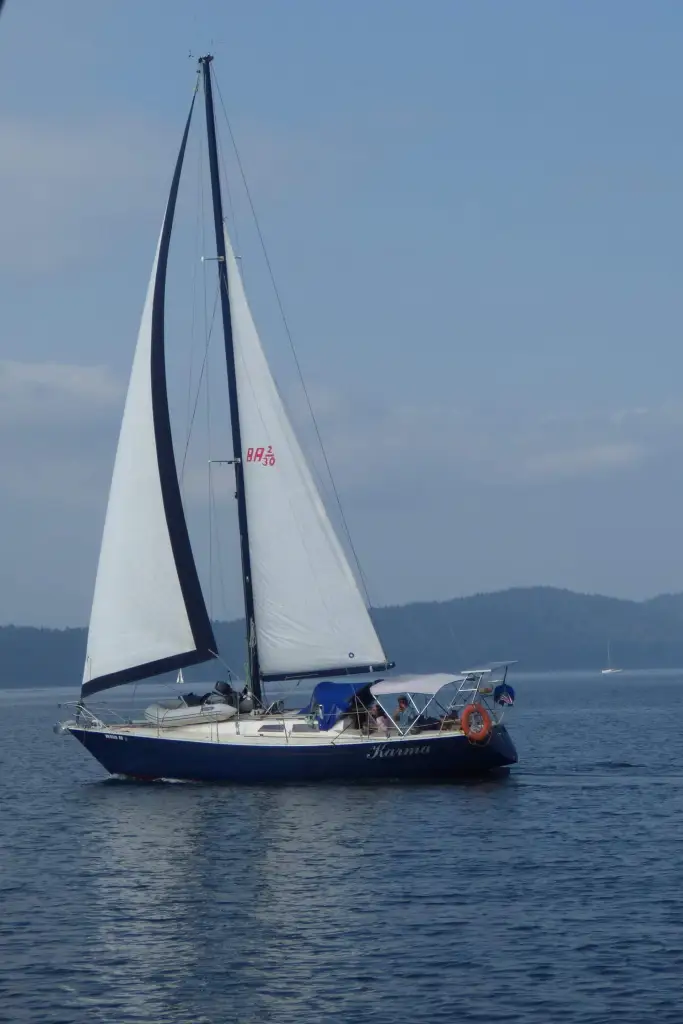 The wind was light so we sailed back and forth past each other time and time again which was a good ole time. Taking lots of pictures of course. It is interesting, it isn’t too often you get to see a picture of your own yacht under sail as it’s too big to get in a photo of yourself onboard and you’re often times too far for anyone else to get a good picture. We chased the wind around for a bit, but as Tivoli had a slip reservation time to meet, they soon “joined the cruising class” and fired up their diesel (from down below of course) and motored on away. We, without a schedule and definitely without a slip reservation, sailed or drifted around at 1kt drinking hot chocolate until we too decided to motor the last few miles to Ganges Harbour where we anchored then dinked in and tied back to Tivoli. Karma under not so full sail