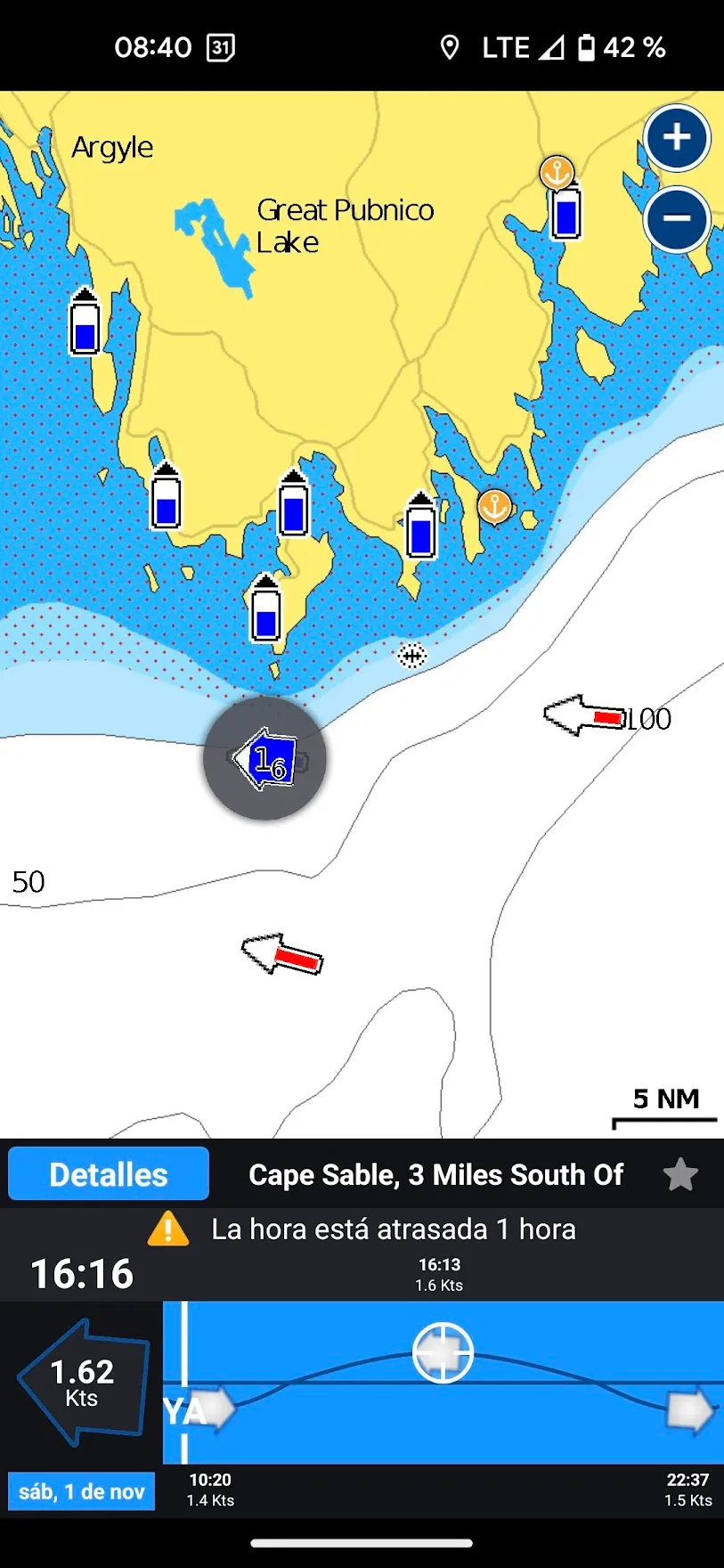 I reefed the headsail further. Eta to the Canal entrance was about 14h30, ie 2 1/2 hours before the current was null. If you ride the current through, you will benefit from about 3 knots on your side at peak. We got there when there was about 1.5 against us. After a brief chat with the kind Canal traffic control, there was no hesitation to proceed except a funky entrance which we can confirm. We struck the sails and motored against uncomfortable waves ~ 5 foot high at the entrance of the canal. The wind was reported 18-22 but we had no issues maneauvoring and proceed past them moving above 3 knots. Part way through our peaceful 4.5 knot, waveless transit, the current shifted and we were motoring with the headsail up (strong wind aft was still filling it the entire transit) over 5 knots by the end.