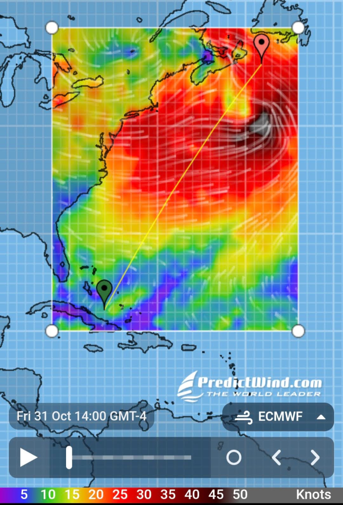The next day, Friday, we filled out our check in info on CBP Roam, half expecting issue since our boat is not officially registered yet…something about a government shut down perhaps affecting it…but none was had. Easy, no boarding or video call. Winds are still blowing like stink but yesterday we put on our glams and had champagne in the cockpit when the sun came out. Just in time to invite our neighbor who dragged over to join us and pass the hunker down times. The first owner of his boat, a Shannon 38, was Morgan Freeman turns out! He is waiting on southbound weather windows to Florida but, as is the case with other sailors we have met, Hurricane Melissa killed or is killing plans. That one is part of the reason the winds are strong now but I’m sure there are other systems in play that are contributing as well. A large chunk of the North Atlantic looks uninviting right now, to say the least.