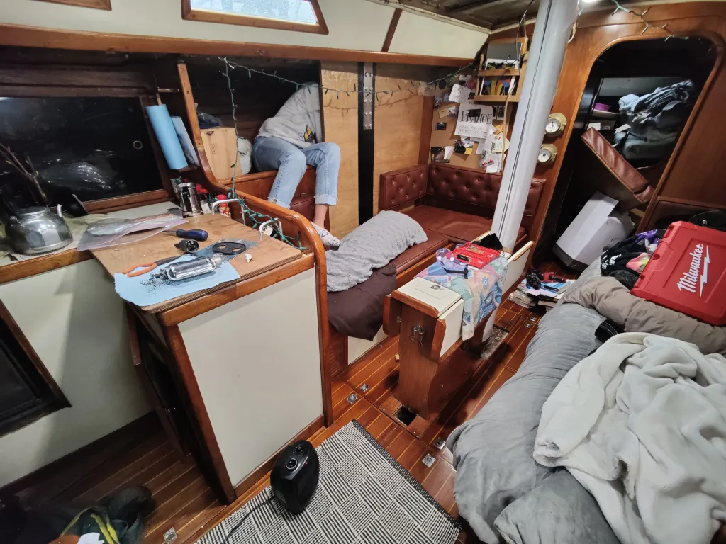 Armed with now the limitations, the answer was going to come in some form of midships exhaust exit, then the heater being in a locker inside the main cabin somewhere. Short exhaust but compromising on it being not at the stern, and heat right into the cabin but taking up some storage space by the heater itself as well as where the exhaust ends up running as well as the heat ducting. After much deliberation we decided the best spot would be behind the port chainplate as far forward as possible. Placing the heater here is the best in terms of limiting all those compromises. The heater is right in the saloon, it is behind the forward seat back cushion you can see below which is a strange and small shaped locker due to the shape of the boat, so not much storage loss. The exhaust runs straight up from there and out the hull which, as we are planning to add shelving to that sea berth, won’t get in the way of essentially any storage. Saloon in full project mode