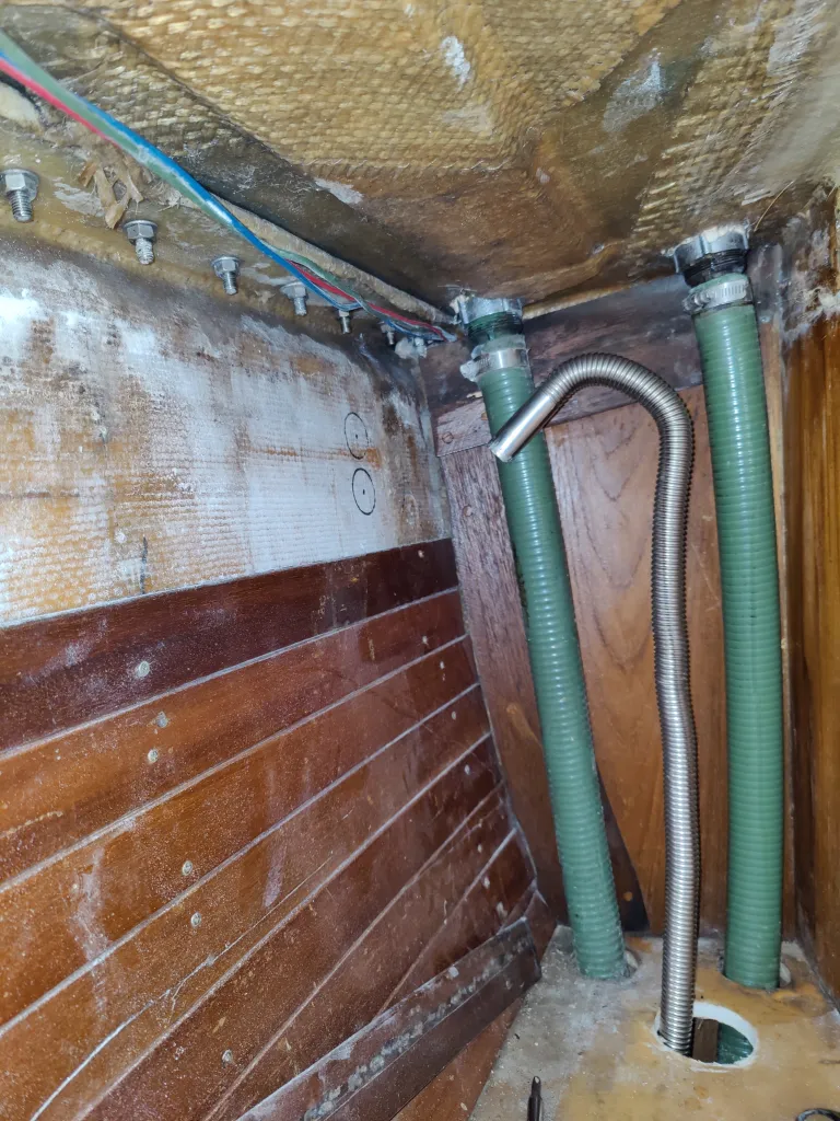 Non of that is particularly difficult, but this is where another aspect of boat projects comes into play, where it is all that stuff has to happen. More specifically, in small tight corners that you fit just 80% into. You can see below the sort of working conditions I was jammed into for what seemed like about a year while drilling, bending, measuring, epoxying and all that. The added bonus of fiberglass dust everywhere which is like leaning on tiny shards of glass is the kicker to make the whole experience a true boat project. Lining up exhaust to cut hole in hull