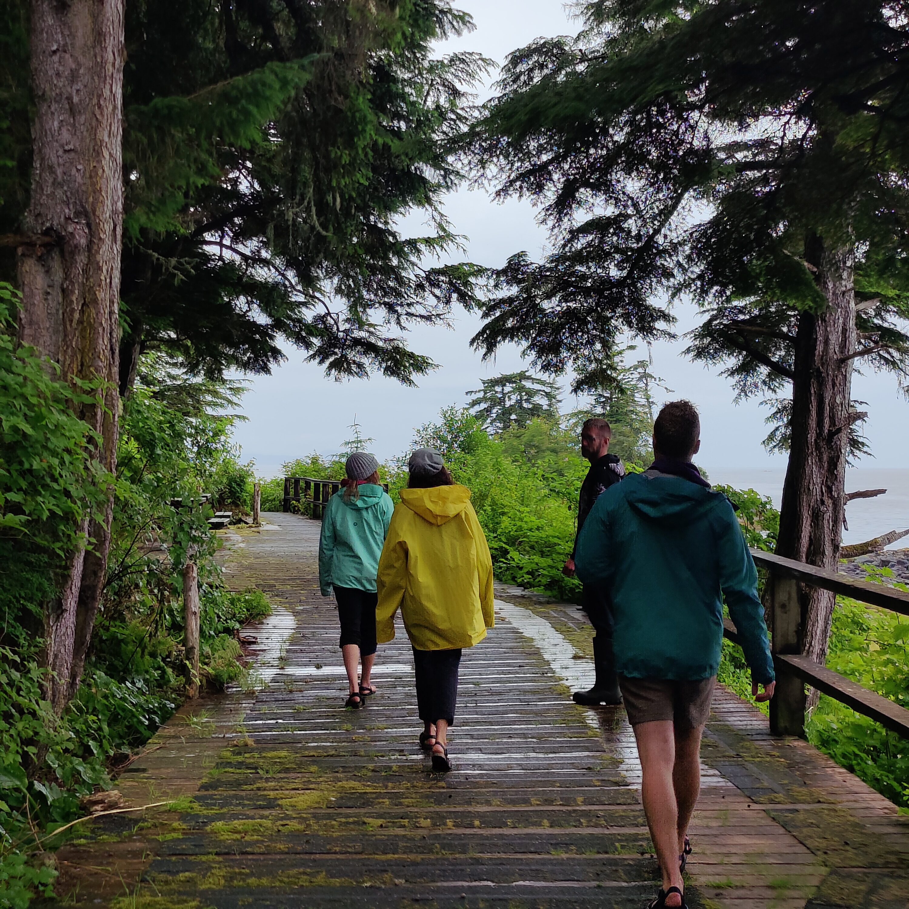 Out on our own again wondering around we ran into Mike, married to the Chief’s daughter, living in town who got the job as the town gardener essentially. He drove us around pointing out people’s lawns that were no longer over grown going, “See that lawn right there? They didn’t have a lawn until I came around, I gave them back that lawn. See that house over there? They had literally no lawn until I came and helped them get their lawn back.” He took us on a trail that went around an old burial ground and showed us a traditional way of processing the abundant devil’s club, said to prevent cancer. Using your fingernail to peel the roots, you get the core of them free then boil it in olive oil for many hours. This infused oil can be applied directly to the skin or used in meals. He has started making beads from the devil’s club in the traditional style as well, which we often saw on women’s woven hats. He now sells them somewhere on etsy for many dollars to folks far away. He pointed out another trail which we took and walked barefoot through the soft woods, before heading back to Karma for a snack. On the way back we came across a house which sold these ice pops out the front door! Surprised to see us random tourists in town, we purchased the tasty snacks for the walk back.