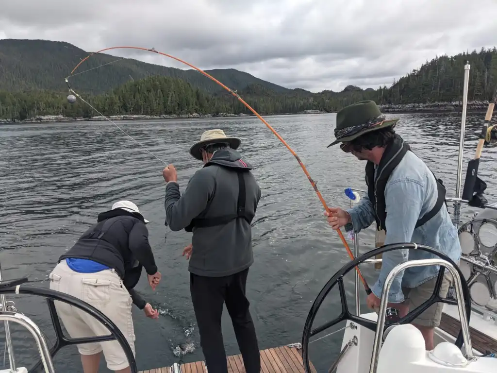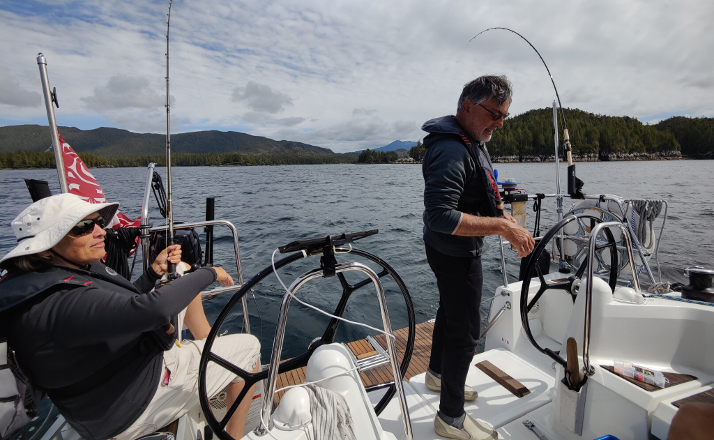 Cruising each and every summer for the last 8 year or so out of Vancouver, Linda and Murat head north when the weather is nice then go around the outside of Vancouver Island to wrap off a summer lap of cruising and fishing. Yes, fishing. This is a major focus of their time on the boat and something we are interested in but know nothing about. Having been up the central and north coast as well as down the outside it was great to get a lot of recommendations and advise on where to go and what to see and what to worry about. Our charts are now littered with anchorages not in any guide books given to us by them.