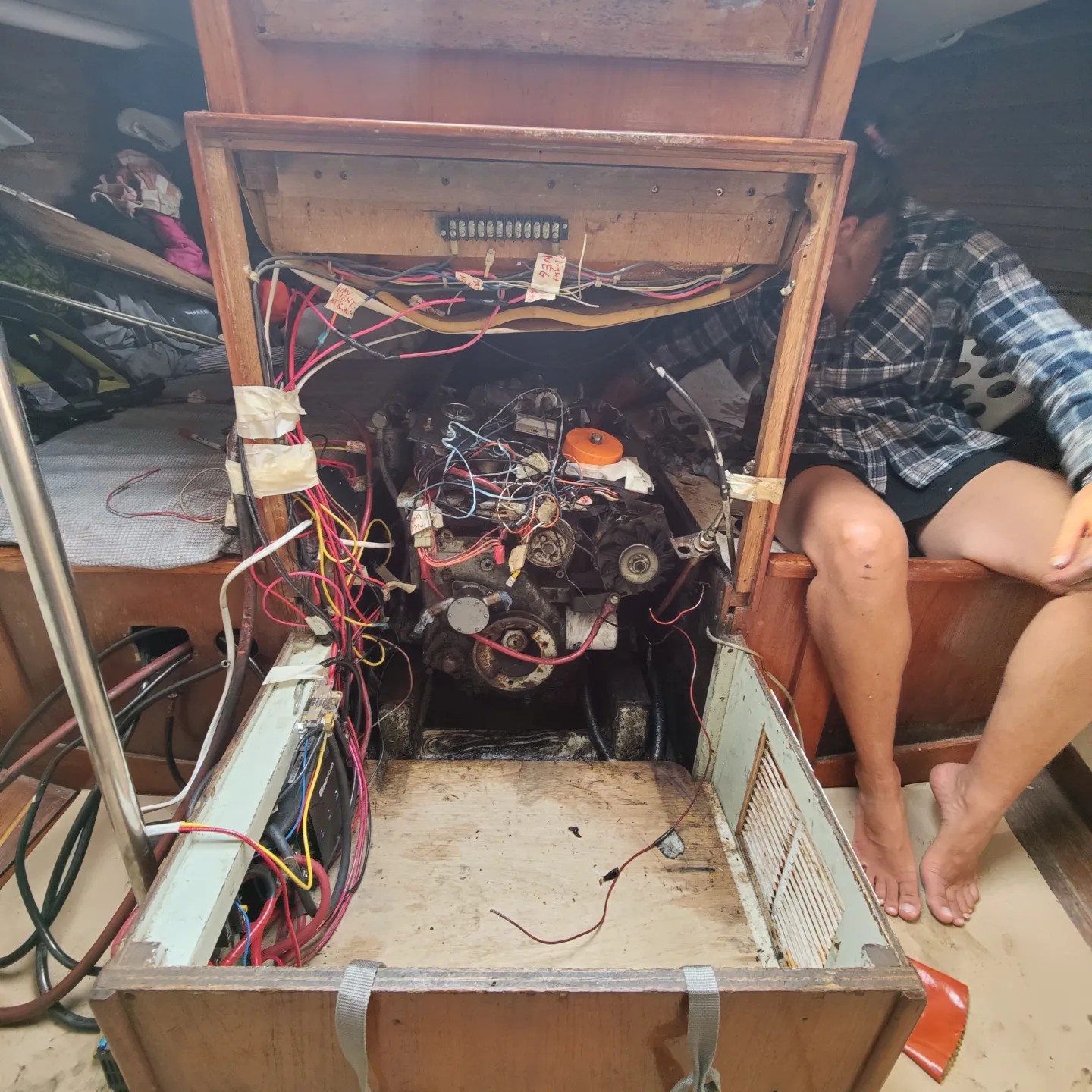 Now the electrical. Our engine wiring ‘harness’ was more of a hodgepodge of wirenuts and speaker wire. With the replacement 2GM20F comes the Yanmar wiring harness and panel, so we left all the engine wires attached and essentially just tied the ‘panel’ and wiring to the engine to be lifted out all as one piece. We just then had to clear a path for the engine by removing our house bank batteries and taping all the house wiring out of the way.