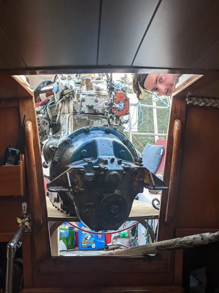 At this point we attempted to lift or just jiggle the engine to see if it’d come loose. It does! We took our dodger down so we could use the main sheet and the boom to lift the engine straight out of the companion way. After a bit of fiddling it was clear we were going to have to zip off the two forward engine mount bolts. Out comes the oscillator and they’re gone in a matter of minutes, how to lift this beast out.