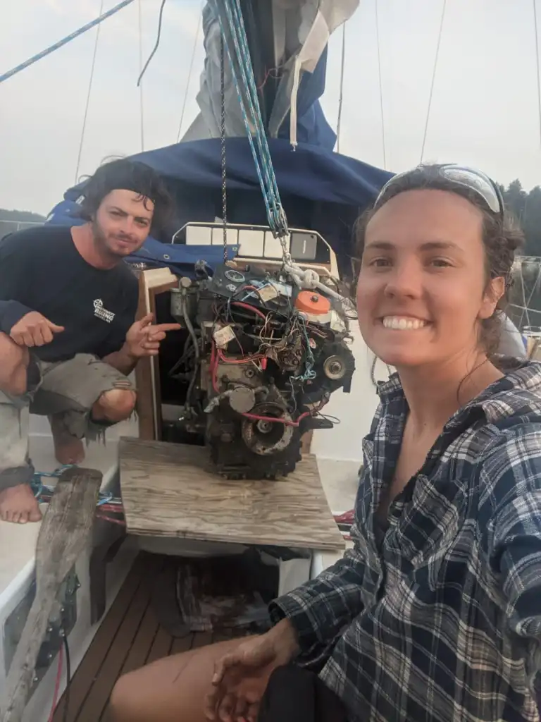 A bit of cranking, a bit of wedging with paddles, a bit of cranking, some leveraging with paddles, out the engine lifted! We placed a board across our traveler and cockpit seats to pull the engine out and place on while we re-situated the lines to move the engine out of the way of the companion way. It is a bit unwieldy to move about, and we did end up getting a line stuck on a winch in a bind we may have to cut to get loose, but we were able to get the engine safely and securely on a cockpit seat on a piece of wood.