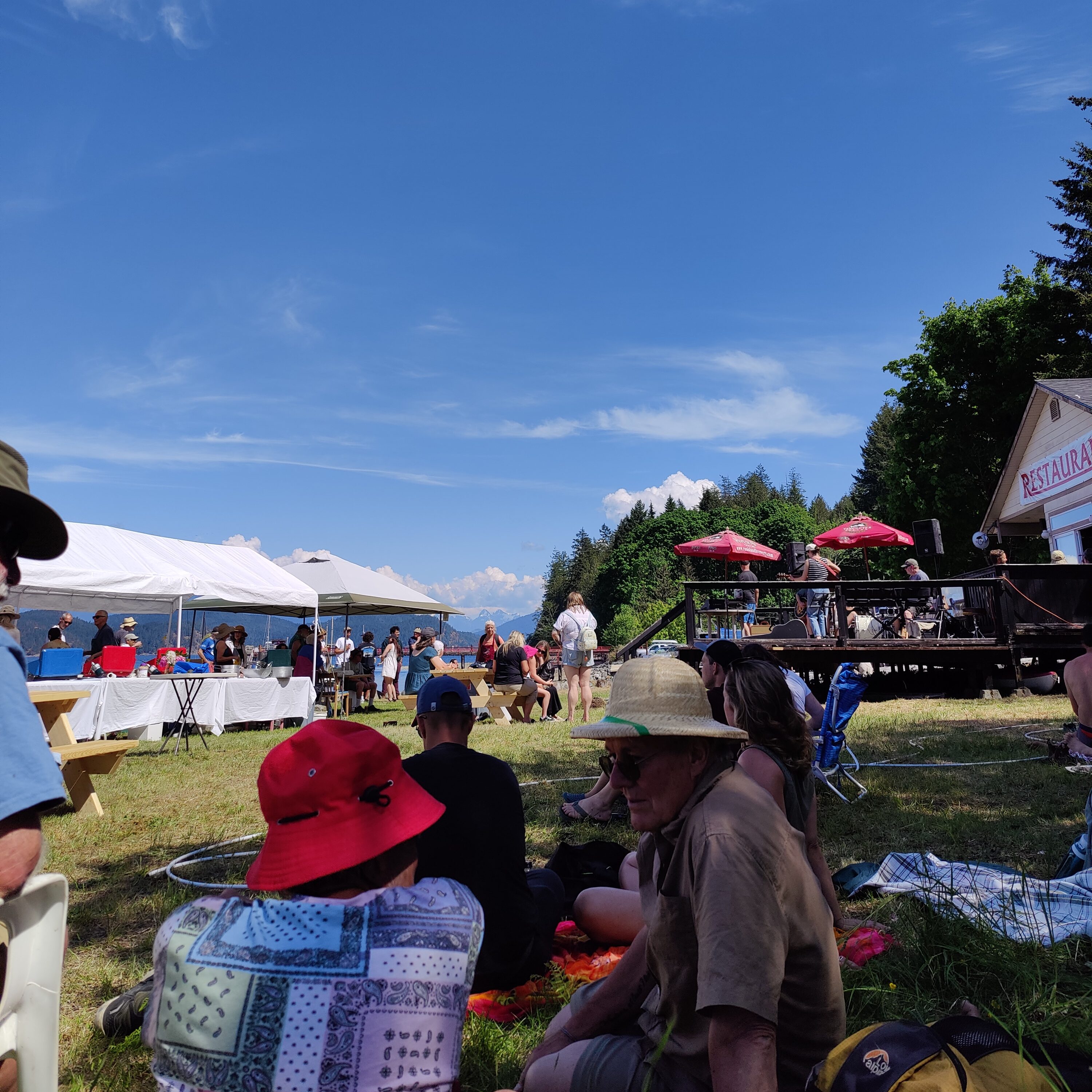 The following morning we were up and paddling and got the scoop on the trails from Ben on Dual Dragons. Wondering if we should hit the town, however, we decided to dinghy the mile or so over and found ourselves at Cortez’s biggest event of the year, the annual OysterFest. The ‘town’ was alight with people lining up to eat at the buffet style tent setup in the middle of the garden while different small local bands played including a First Nation man from the area. We hung out on the grass, tried the native fry bread, Bannock, from the local tribes, and listened to the music and watch the crowd. A highlight was the pie which a lady from neighbouring Quadra Island bakes but once a year for this festival, and the Canadian Coast Guard walking around eating everything they passed.