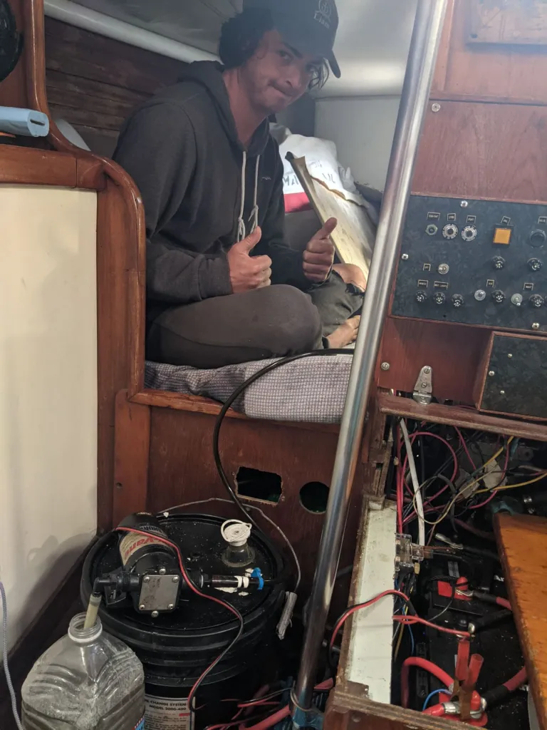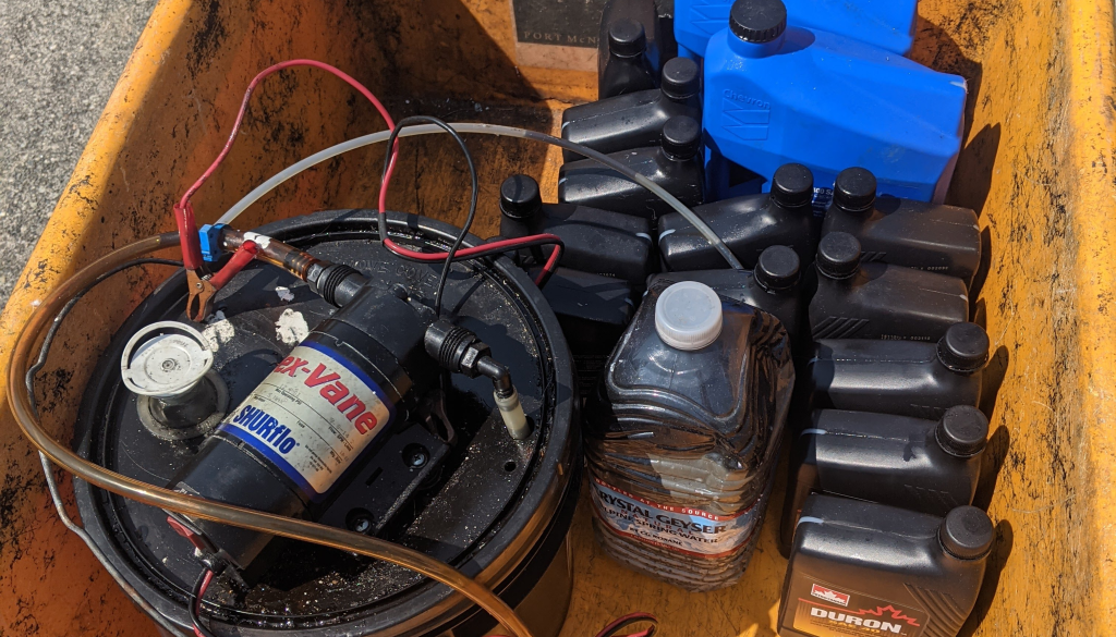 The salty engine needed to be flushed before we abandoned it for 2 weeks to prevent damaging corrosion. And our timeline was absolutely squished screwy because we had a car, ferry, and a plane depending on us to have Karma tied to a dock far away by Sunday night. It was Friday night when we diagnosed the issue and realized we can’t fix a part that needs replacing. We only had 3 liters of extra oil and our engine takes about 5. We milked the tiny ounce of service we could get to look for solutions. I am confident this is a comprehensive list because our brains were easy bake oven racked to compile it.