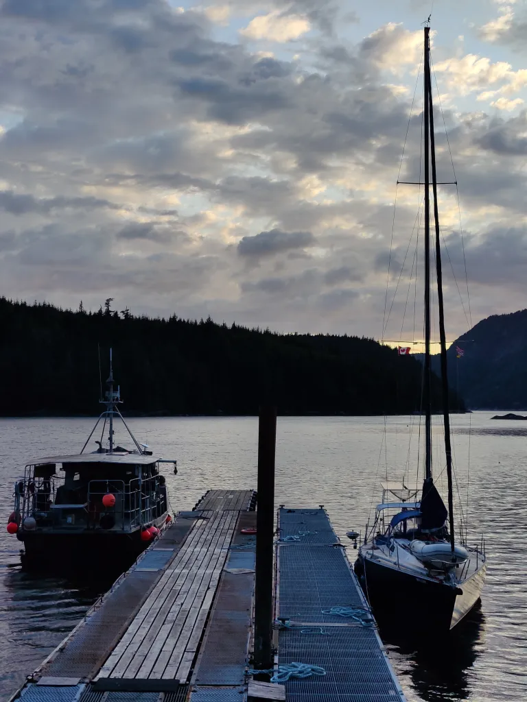 The Honeymoon Dock hosting Karma adjacent and a prawning boat at Lagoon Cove