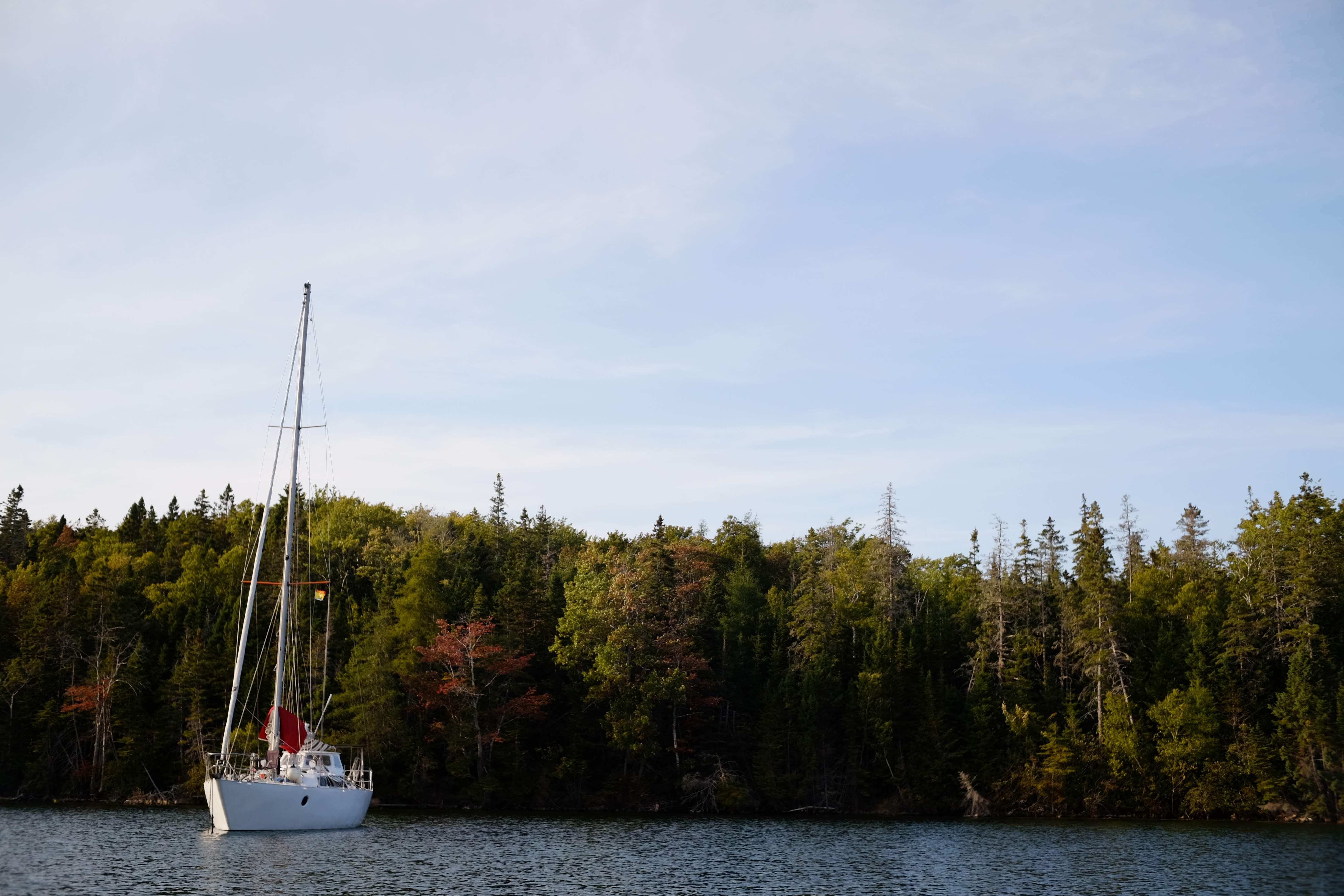 We enter around a light house and it is decently windy. There is a superyacht at the far end of the bay and so we tuck around a small corner and stern tie again as all the lines are out. The wind though later in the day is supposed to switch so we decide it’s probably prudent to move. We do a few circles driving around in the wind and hooking sea weed before taking the spot the superyacht was in right in the middle of the bay. It is definitely a scenic spot this. Surrounded by an actual landscape with some height to it, unlike the completely flat New Brunswick and Prince Edward Island, we are around about two corners where you can see past a scenic rock beach and then to the main point with a classic red and white Nova Scotia lighthouse.