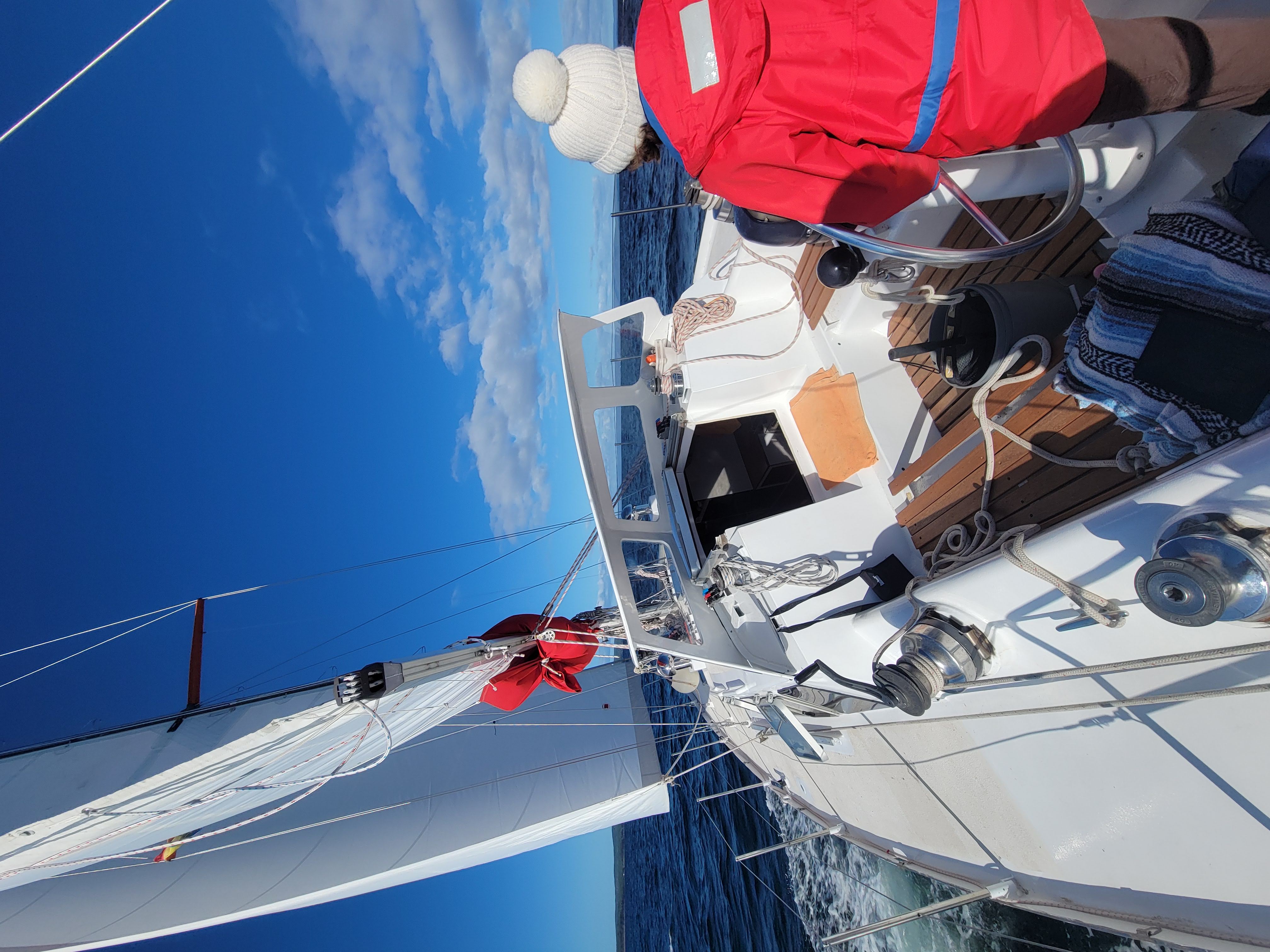 With the weather being nice we set off the following morning, sailing off the anchor and out into a completely windless bay. A smaller 30 or so foot cruising sailboat anchored for the evening on the other side of the cove, and now they motored out and passed us whilst we drifted around, sails just hanging on the mast not pulling their weight.
