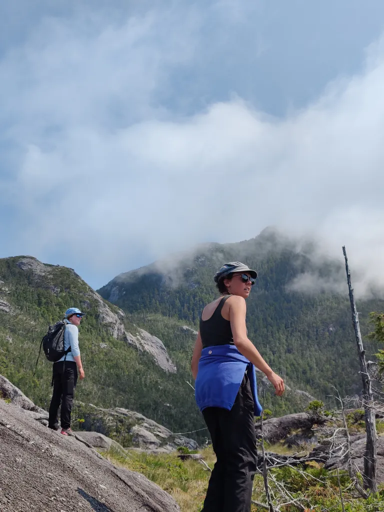 Being an uninhabited island amongst a vast chain of uninhabited islands far from any settlement lands us clambering over trees, through bushes, and entirely making the trail up ourselves. It was a good move that we all were wearing pants and not shorts. The fog had mostly cleared at this point and each time we find ourselves on a rock out of the thicket of trees the view gets better and better. It was surprising how high we were actually able to climb up, though eventually we were at a peak which was separated by a huge valley which had us snacking and calling this the top for us.