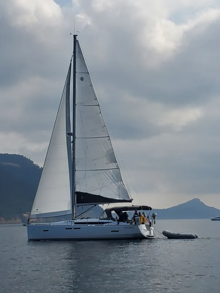 Monday rolls around, the internet service at Montegue sucks making work difficult so I solved that by taking the two days off, and Tivoli arrives in full force with the rest of the flotilla. After they grab the mooring ball we go onboard and meet the crew. Aboard were three serious sailors, one of which Linda sailed with in the BVIs in a charter earlier in the year. Mary (the BVI charter captain) and Gail race rather seriously together on S/V Abstract out of Portland. Both of them have done some serious offshore races as well such as the Americas Cup to Hawaii and a Fastnet! It was excellent hearing from them and we even all piled into our trouper of a WestMarine dink to have a tour of Karma.