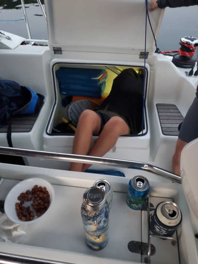 This all sets us up to miss the pub bus, of course. Anytime a Frazer or a byproduct of one is involved everything is automatically delayed by 10 to 50 minutes. No worries, Tommy comes around about every 45 minutes and so Heather and I play pine cone hacky-sac with the Tivoli crew until the Transit Master himself arrives. We had a lovely dinner at the classic Hummingbird cafe and headed on back for sundowners and chats well into the night. Tivoli even has underwater lights off the stern, a true super yacht like feature to have on a 40 foot cruising boat. While that is a nice feature, and the boat is probably less than 5 years old, it’s not without its own issues. The outside engine controls don’t work! They have to start the engine from the starter inside the boat on the engine. As you can see below, we can’t escape boat projects even if we go aboard someone else’s almost new yacht. Heather in Tivoli’s lazz