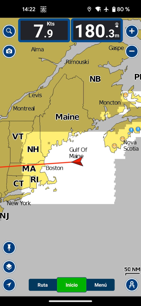 The Gulf of Maine is the body of water south of the Bay of Fundy, sandwiched between Nova Scotia and Cape Cod in MA. If you don’t know of the Fundy, you should know that the tides are quite large. This can create exciting waves near the entrance and the tip of the Scotia; if the wind is opposing the current, all the more exciting. The game to play regarding passage planning for western Atlantic this time of year is one of threading the needle between hurricane season & winter storms. The likelihood of hurricanes directly hitting the Scotia is always low but obviously once the Atlantic season as whole “ends” come November it’s even less. BUT the chance of a gnarly winter storm increases of course as winter progresses. Being out of season seems to be our modus operandum so this game is a welcome one. Close to the Scotia, we infrequently saw speeds over 10 while surfing the waves but 12 knots while surfing became the norm not long after. The boat shudders at this speed. Probably it’s the rotating propeller churning up water on the hull. I clocked 12.4 at some point and another time a huge wave put maybe 4 inches of water into the cockpit.