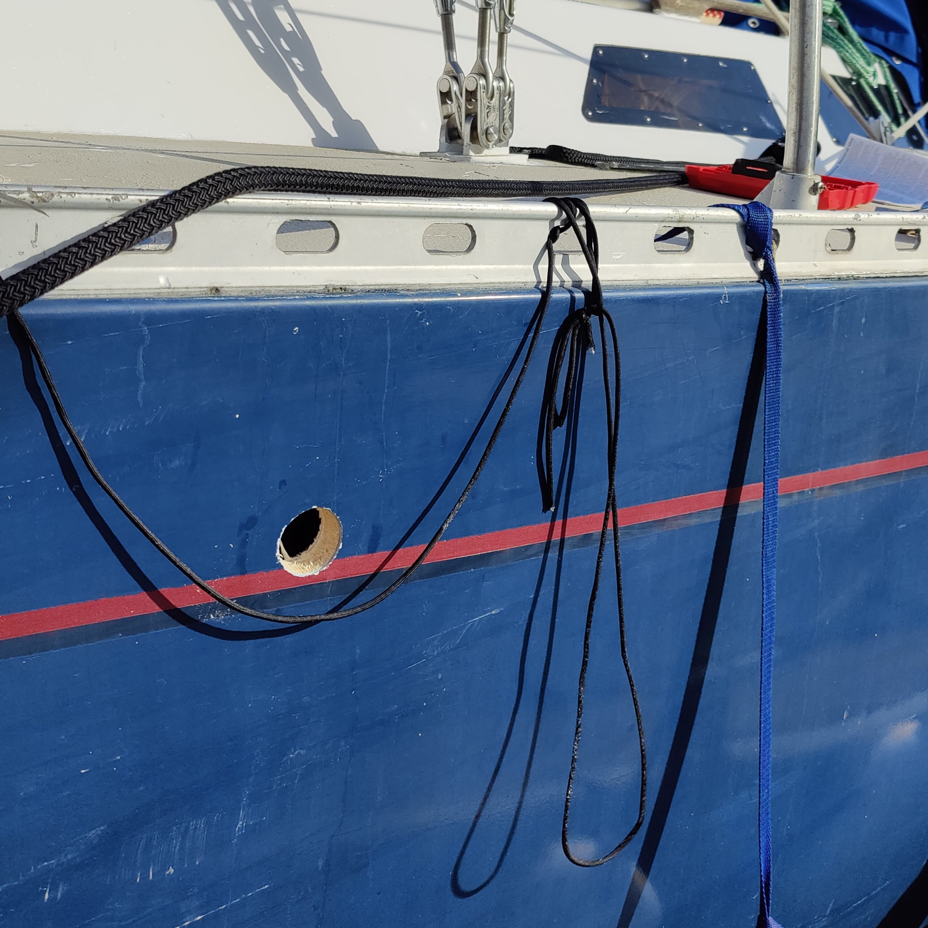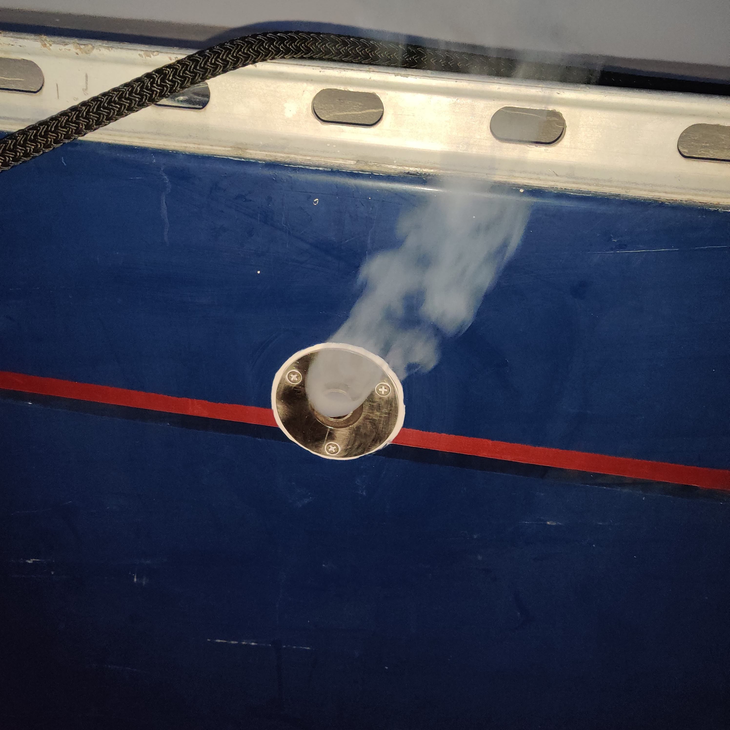 The main concern with this type of heater really is the exhaust. Both that the exhaust pipe is hot as well as that the exhaust in the pipe is toxic if leaked into the boat. Planning the heater’s placement around the best possible scenario for the exhaust really makes a lot of sense. We replaced the included hose-clamps with fancy pantsy exhaust hose clamps which are way more solid and get significantly tighter in an even fashion around what they’re clamping. We also used Permatex which is like a sealer that heats up on initial use and stops gasses escaping. Of course, there is also a carbon monoxide monitor in the locker with the heater as well and we have yet to measure any CO at all! We used a forstner bit to drill the large hole you see above where the exhaust comes up from the heater, then used a regular hole saw to drill the actual hole through the hull seen below. 1.5″ hole drilled in hull for exhaust