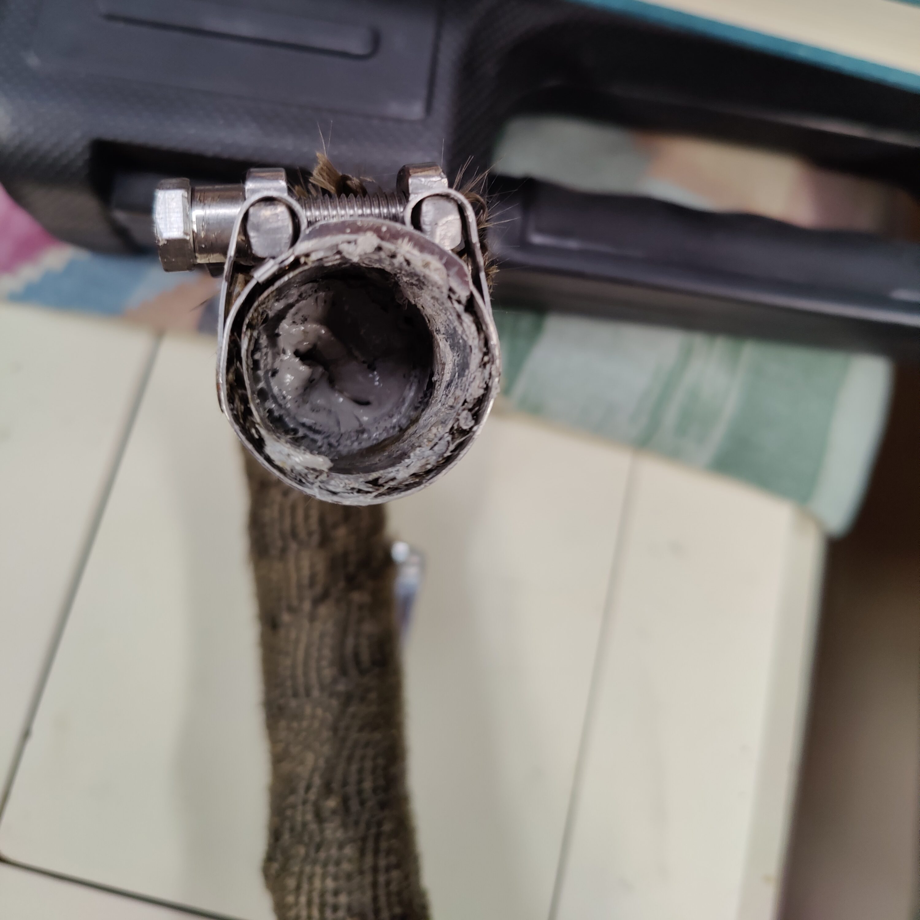 Sure enough, there was serious cloggage caused by the extreme amount of Permetex I had put at the seal to ensure exhaust didn’t leak. While our exhaust still has some pretty extreme bends and angles to it, I was hopeful that clearing this all out would help out situation. I dug that hardened glob out and then shot water through the exhaust pipe both directions to make sure it was as clear as I could make it without bending the whole thing straight. Clogged exhaust which causes the heater to not light