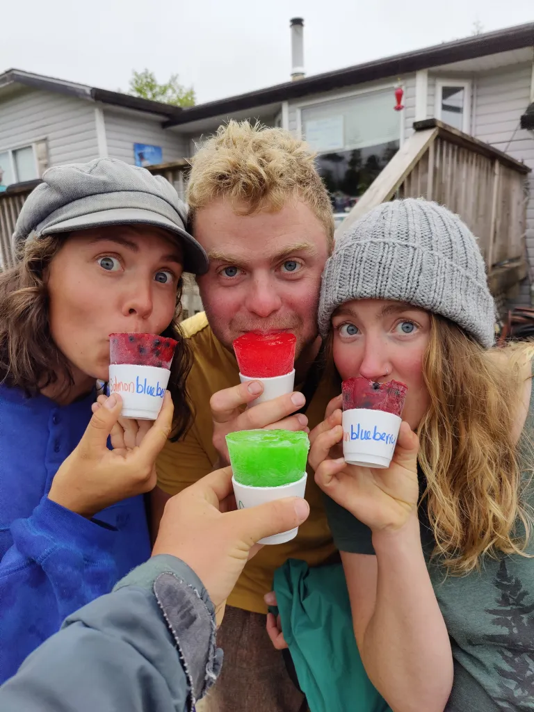 Out on our own again wondering around we ran into Mike, married to the Chief’s daughter, living in town who got the job as the town gardener essentially. He drove us around pointing out people’s lawns that were no longer over grown going, “See that lawn right there? They didn’t have a lawn until I came around, I gave them back that lawn. See that house over there? They had literally no lawn until I came and helped them get their lawn back.” He took us on a trail that went around an old burial ground and showed us a traditional way of processing the abundant devil’s club, said to prevent cancer. Using your fingernail to peel the roots, you get the core of them free then boil it in olive oil for many hours. This infused oil can be applied directly to the skin or used in meals. He has started making beads from the devil’s club in the traditional style as well, which we often saw on women’s woven hats. He now sells them somewhere on etsy for many dollars to folks far away. He pointed out another trail which we took and walked barefoot through the soft woods, before heading back to Karma for a snack. On the way back we came across a house which sold these ice pops out the front door! Surprised to see us random tourists in town, we purchased the tasty snacks for the walk back.