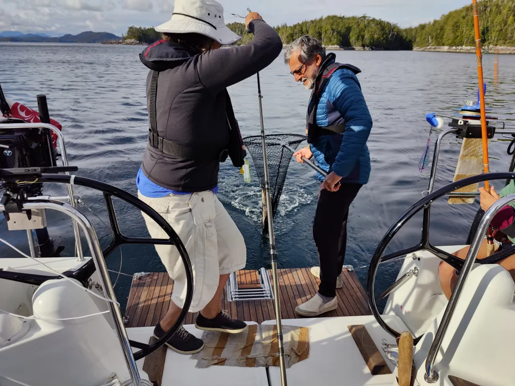 Cruising each and every summer for the last 8 year or so out of Vancouver, Linda and Murat head north when the weather is nice then go around the outside of Vancouver Island to wrap off a summer lap of cruising and fishing. Yes, fishing. This is a major focus of their time on the boat and something we are interested in but know nothing about. Having been up the central and north coast as well as down the outside it was great to get a lot of recommendations and advise on where to go and what to see and what to worry about. Our charts are now littered with anchorages not in any guide books given to us by them.