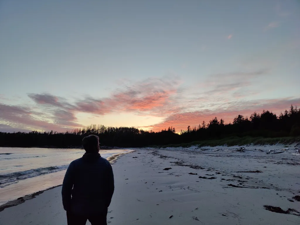 A lunch and a beach hang out day later of sunbathing and using Heather’s sun harnessing wood burning appratis, we went back in search of Linda and Murat for the sunset walk. While initially not up for it, we all 4 eventually set off for just the West Beach to get a view of the sun setting over the Pacific Ocean. Hilariously enough, the sun sets pretty far north at this lattitude so we were watching it over the trees with the ocean to our left, but it was a good one never the less and there isn’t much better than a beach walk with friends anyway.