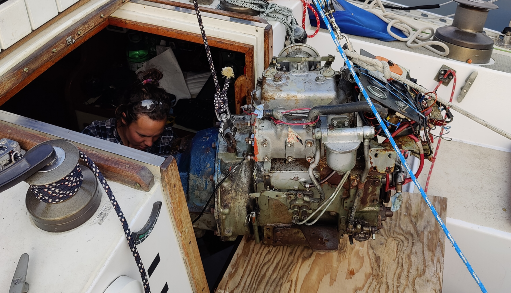 At this point we attempted to lift or just jiggle the engine to see if it’d come loose. It does! We took our dodger down so we could use the main sheet and the boom to lift the engine straight out of the companion way. After a bit of fiddling it was clear we were going to have to zip off the two forward engine mount bolts. Out comes the oscillator and they’re gone in a matter of minutes, how to lift this beast out.
