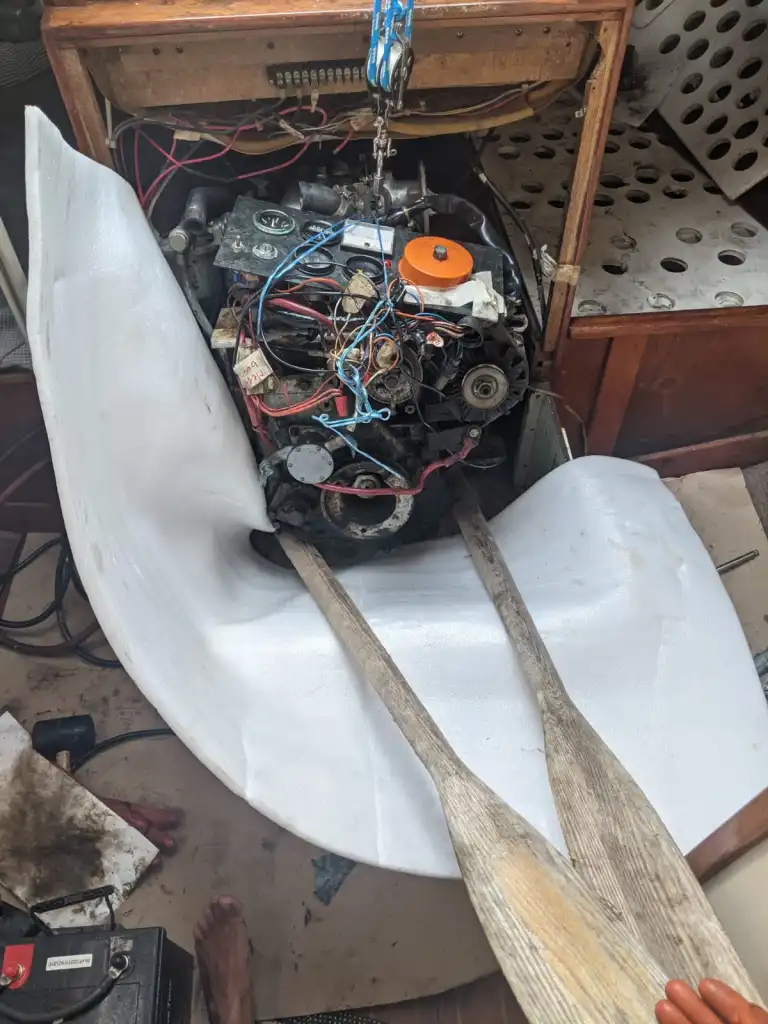 A bit of cranking, a bit of wedging with paddles, a bit of cranking, some leveraging with paddles, out the engine lifted! We placed a board across our traveler and cockpit seats to pull the engine out and place on while we re-situated the lines to move the engine out of the way of the companion way. It is a bit unwieldy to move about, and we did end up getting a line stuck on a winch in a bind we may have to cut to get loose, but we were able to get the engine safely and securely on a cockpit seat on a piece of wood.