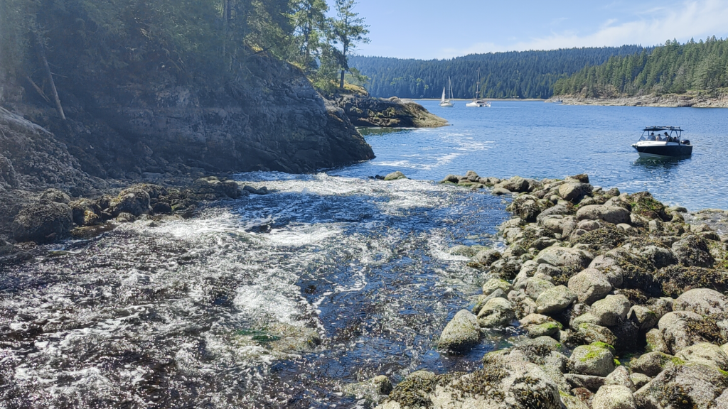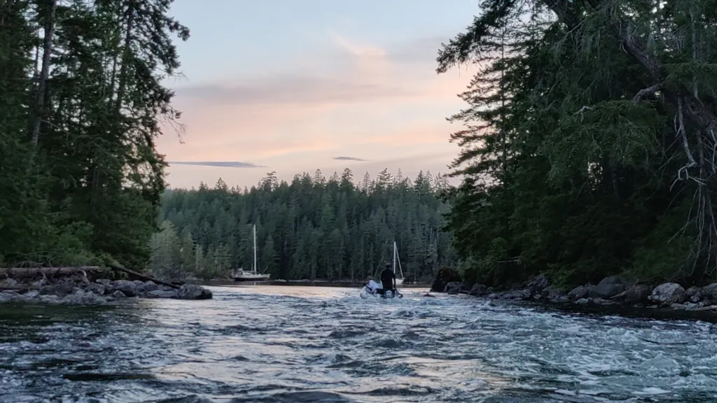 As the festival wound down we walked the streets for a bit before deciding to head back to the anchorage. After heading back we decided to take the dinghy through the rapids at the end of the bay. There is a lagoon which is maybe 10 feet above low tide at the north end of Squirrel Cove which means at low tide there is a waterfall, and at high tide the water in the Cove is above the lagoon leaving the water to run in a rapid back into the lagoon. At high tide the depth is such that you can dinghy in. Having seen the waterfall coming the other direction earlier on the paddleboard, it was strange to realize the same place now had the water in the reverse direction and it wasn’t a 5 minute walk up over the rocky waterfall to get to the other body of water. We flipped up the outboard to be save and whipped out the oars to do some classic Montana style rafting in our Aquapro RIB down the rapids.