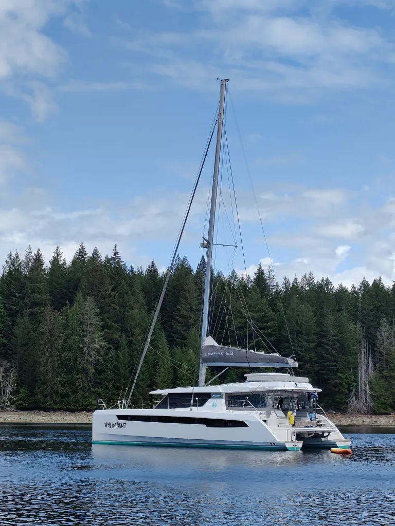 Dinghying over to the Leopard 50 catamaran, we had a choice of which stern to go to for the first time in our cruising careers. After being welcomed aboard we got the grand tour of what could have been a comfortable family home for 5, with its 4 separate queen sized staterooms, owner’s hull, 4 bathrooms with hot showers, and a mirayd of fridges, freezers and deck space for lounging both on top, aft, and in front of the coachroof.