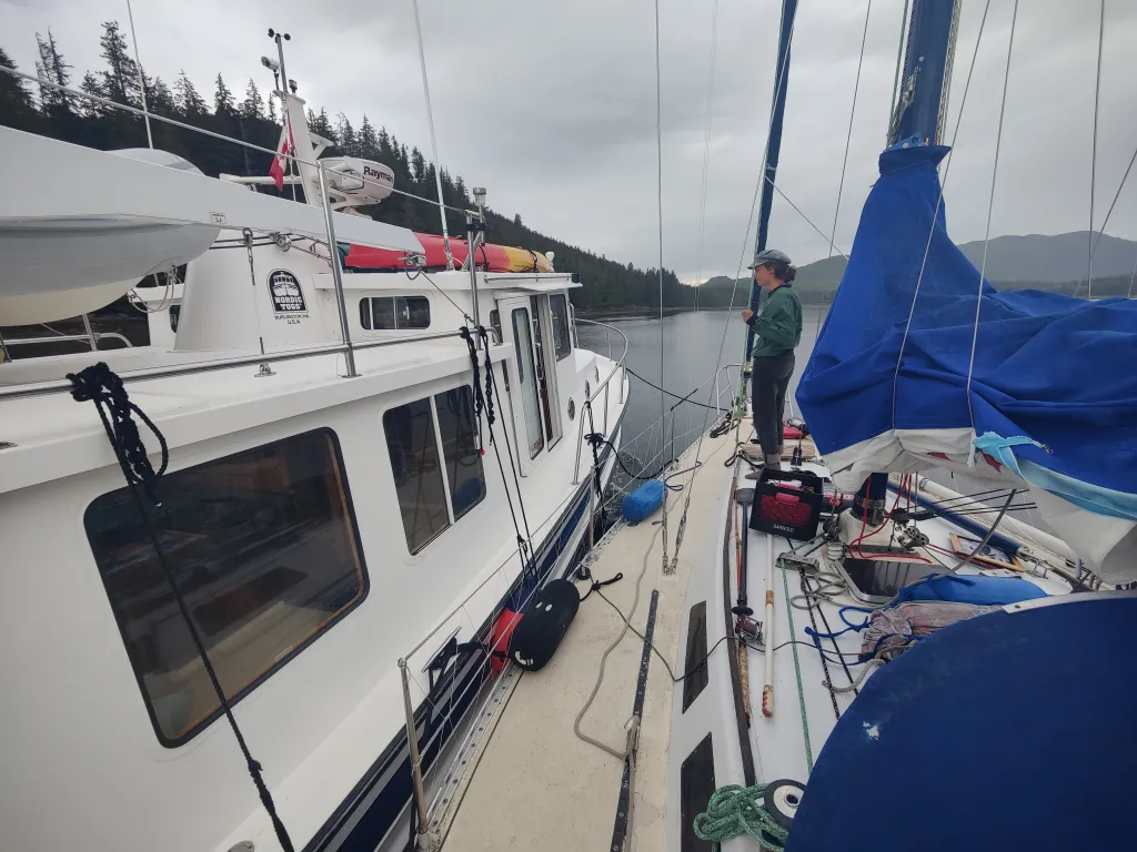 The Hail Mary Er, The Harmony Bay. This is the one where we flag down unexpecting boats and guilt them into helping us. We saw two fishing boats the day prior. Around 7am we called the Coast Guard to put in the Marine Assistance Request. Now to hail passing boats. The first didn’t respond and ignored our waves. The second boat looked like a cruising boat. We hailed them blindly on the radio, not seeing their boat name, and Liam told them the situation. They said oh sorry that can’t be us. Welp. They headed into the narrow Chatham Channel as we stood on deck sadly watching them go by. Independently they figured there must have been a miscommunication and retreated. Liam mistakenly told them the name of a Bay in Desolation Sound many miles away instead of Hadley Bay. Within two minutes of coming over, the Nordic Tug named Harmony Bay had fenders and lines staged for a hip tie. 9:10am we were underway. “Oh we used to sail. Of course we will tow you no problem. We’ve been towed myriad times.” :”’)